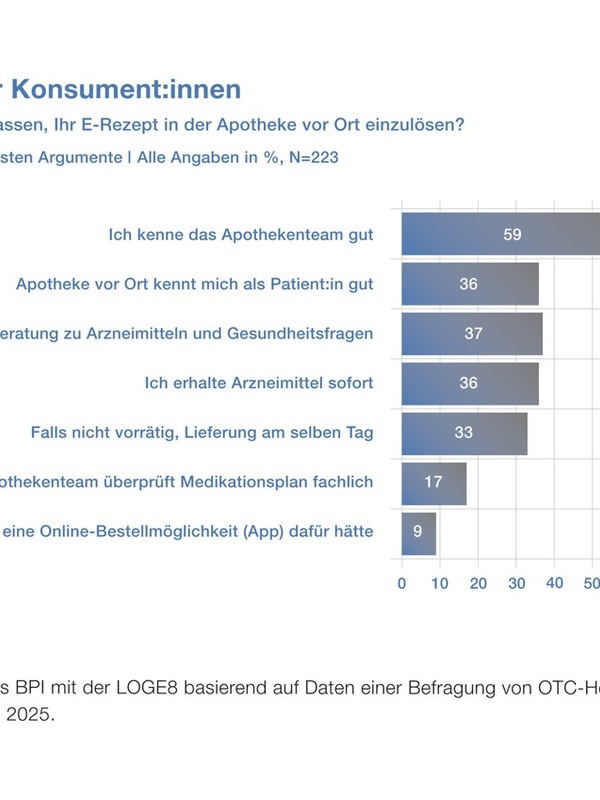 Konsumentinnen und Konsumenten lösen ihr E-Rezept vor allem deshalb in der Vor-Ort Apotheke ein, weil sie das Apothekenteam persönlich kennen, und das Team wiederum sie. Interessant im Vergleich zum Vorjahr ist, dass nun auch die sofortige Verfügbarkeit von Arzneimitteln als Argument hinzukommt (2024 lag dieser Wert bei nur 5 Prozent).