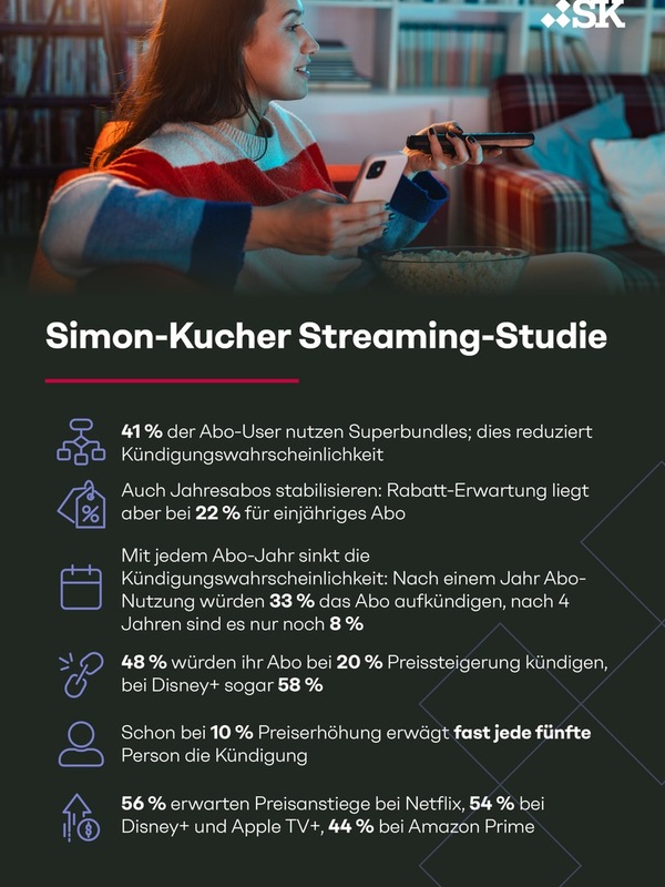 Mit 41 Prozent nutzt fast die Hälfte der Streaming-Abonnenten Superbundles. Während die User vielfältige Vorteile mit TV-Optionen genießen, sind die Kombi-Abos für Streaming-Anbieter dabei vor allem ein Mittel, die Kündigungswahrscheinlichkeit zu senken. „Wer Inhalte über ein Bundle bezieht, bleibt in der Regel länger – der wahrgenommene Nutzen steigt, spontane Kündigungen sinken“, so Lisa Jäger, Partnerin bei Simon-Kucher. Für Anbieter bedeutet das: höhere Loyalität und stabilere Umsätze pro Haushalt.