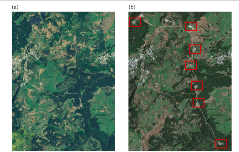 Was die Arbeit von Zhang et al. (2025) besonders wertvoll macht, ist ein kleines Detail, das sich zum Ende des Beitrags findet, ein vorher-nachher-Vergleich einer bewaldeten Region in Yunnan, die Gegenstand der Arbeit ist. Die Bilder zeigen einen dramatischen Unterschied im Bewuchs, den man kaum anders als Ergebnis einer mutwilligen Zerstörung ansehen kann. Aber sehen sie selbst. Links der Zustand 2012 unmittelbar vor Beginn der Bauarbeiten, rechts der Zustand nach Abschluss der Bauarbeiten.
