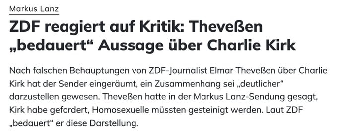 Auch die Lügen, die Theveßen im offensichtlichen Bemühen – wie man es eigentlich nur bei Kranken sieht – den gerade ermordeten Charlie Kirk zu diffamieren, erfunden hat, sie sind nicht weiter tragisch. Elmar hätte nur differenzierter sein müssen, meint man beim ZDF.
